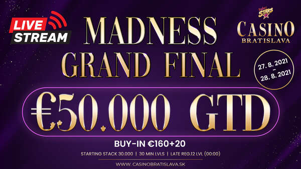 A je to tu. Po dvoch mesiacoch a letnej sérií turnajov Madness sa kruh uzatvorí záverečným dielom – GRAND FINAL. V piatok sa rozohrá DAY 1 z turnaja, ktorý následne v sobotu vyvrcholí aj pod televíznymi kamerami finálovým dňom. Kto sa stane šampiónom a získa 10.000€?