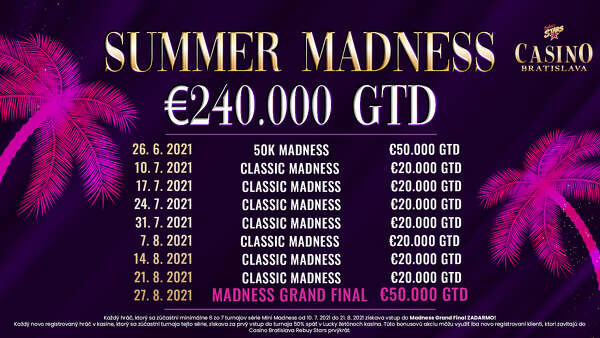 Leto v najväčšom slovenskom poker roome – Casino Bratislava Rebuy Stars – je v plnom prúde. A s ním aj ďalšie turnaje, na ktorých môžu hráči vyhrávať tisícky eur. Hlavným ťahákom je sobotňajší Madness Classic 20.000€ s buy-inom 90€+10€.